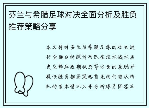 本文将对芬兰与希腊足球的对决进行全面分析,探讨两队在技术、战术、历史交锋和近期状态等方面的表现,并提供胜负推荐策略。首先,我们将从两队的基本情况入手,分析球员阵容及球队风格;其次,讨论各自的战术布置及适应能力;接着,回顾两国足球历史上的交锋记录,以便了解双方心理层面的影响;最后,将结合近期比赛状态,...